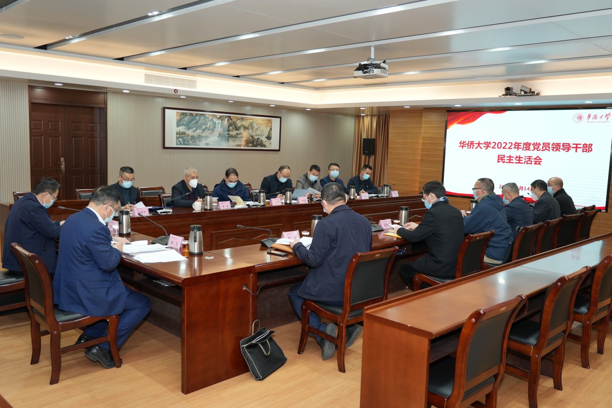 根据党中央部署和中央统战部、福建省委要求,华侨大学党员领导干部2022年度民主生活会于2月14日召开。会议以全面贯彻习近平新时代中国特色社会主义思想,深刻领悟“两个确立”的决定性意义,增强“四个意识”、坚定“四个自信”、做到“两个维护”,团结带领党员干部群众以奋发有为的精神贯彻落实党的二十大作出的重大决策部署为主题,紧密联系学校工作实际,深入进行对照检查,严肃开展党性分析,认真开展批评和自我批评。