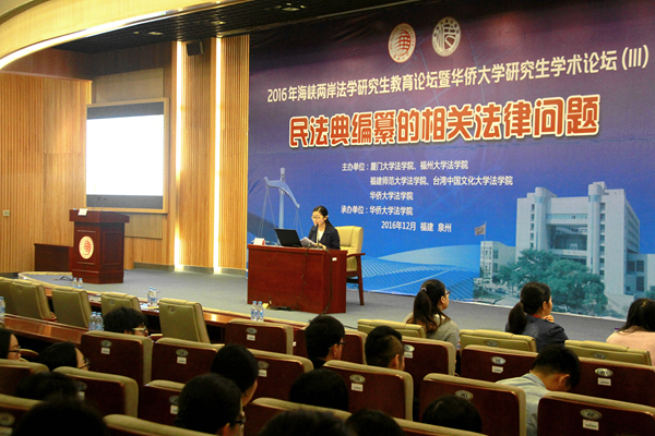 12月11日,2016年海峡两岸法学研究生教育论坛暨华侨大学研究生学术论坛在陈嘉庚纪念堂举行。来自海峡两岸高校法学专业的研究生及研究生导师以主题报告会的形式,共同研讨民法典编纂的相关法律问题。