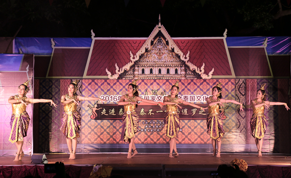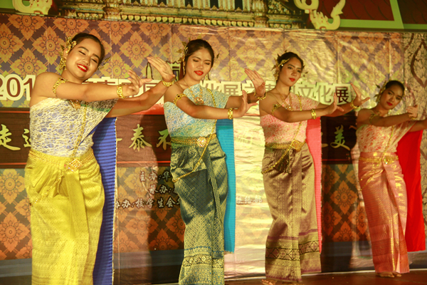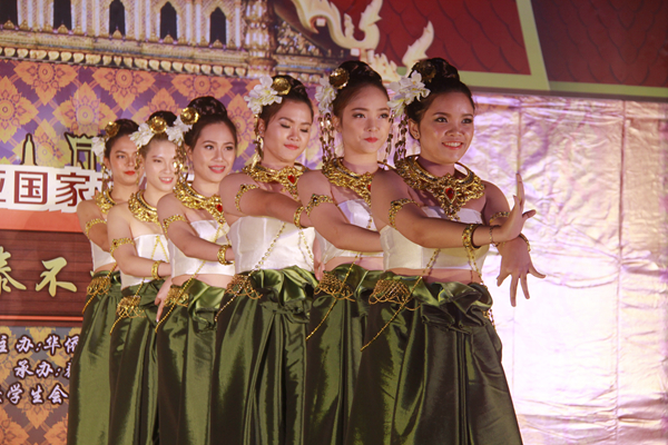 伴随着悠扬的音乐,泰国的同学们身着盛装款款步入舞台,以舞蹈《暹罗微笑之邦》开场,用一颦一笑问候所有的观众。来自中国、泰国、缅甸三个国家的主持人身着特色服装,邀请嘉宾佩戴胸花、水灯祈福、泼洒花瓣,寓意泰国文化展开幕。
