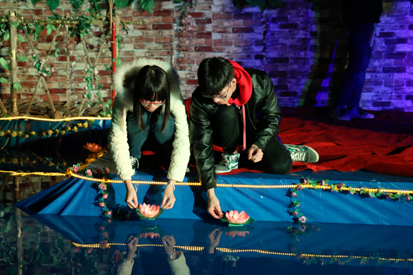 同学们放下水灯许愿