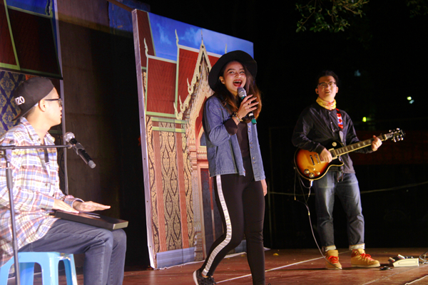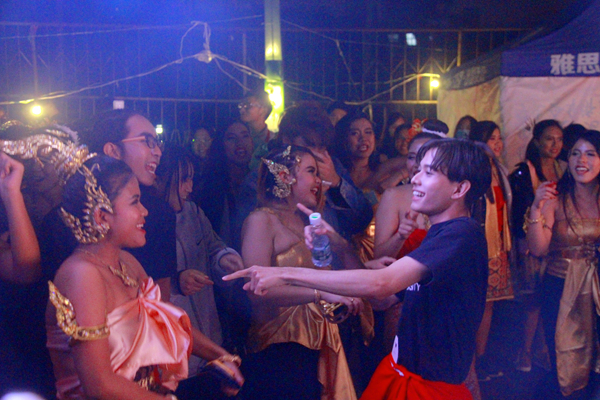 开幕式晚会由多彩泰国、神话泰国、摩登泰国三个篇章串联而成,每个篇章都由不同风格的舞蹈组成,或舒缓、或轻快、或细腻、或激昂。用椰子壳制成的传统乐器表演的舞蹈《森嘎啦》传递着泰国同学的喜悦与兴奋,演员们奇思妙想,以古典舞曲《梅丽的神话》配现代舞蹈,扑朔迷离的灯光糅合在夜幕细雨中,引得现场欢呼阵阵。压轴出场的无名乐队不仅带来了泰国经典歌曲,更精心准备了《月亮代表我的心》《爱我别走》等中文歌曲,将现场气氛推向高潮,同学们更是伴着激情飞扬的歌声在细雨中热情共舞。