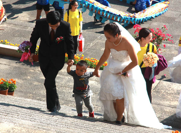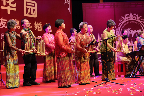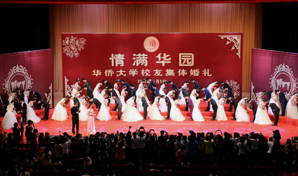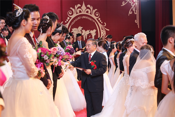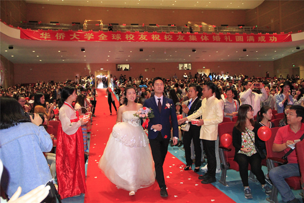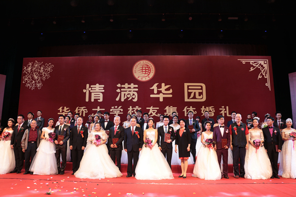 华侨大学56周岁的生日刚刚过去,校友将他们的婚礼置于母校,让母校见证他们的爱情,让身边的老师、同学见证他们最幸福喜悦的一刻。许多老校友们更是排练了东南亚风格的舞蹈和表演迎接新人的到来。华侨大学校长、校友总会会长贾益民,党委副书记、校友总会荣誉会长朱琦环,副校长、校友总会副会长曾路,以及来自世界各地的校友代表、新人亲友及千名师生出席了此次婚礼。