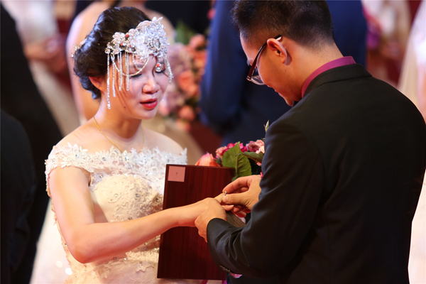 婚礼依旧采用中西合璧形式,求婚与交换戒指浪漫上演,中式三拜却也显得庄重神圣,全体新人在彼此的深情对望中许下爱的誓言。在热情的师生的簇拥下,新娘们集体抛出婚礼花球,将全场气氛引向最高点。