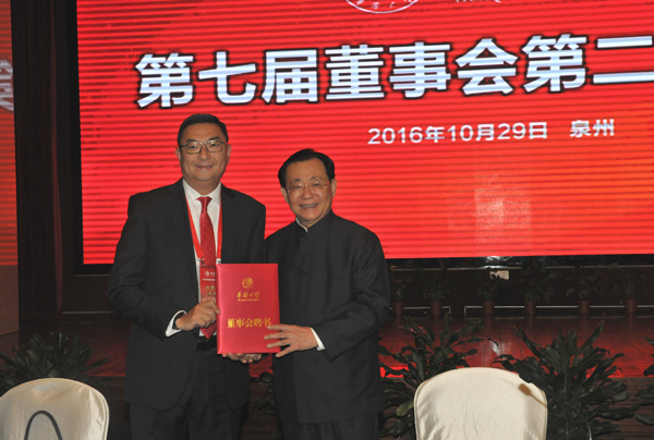 在华侨大学第七届董事会第二次会议上,董事长王刚为新聘董事颁发聘书。至此,第七届董事会现有董事117人。