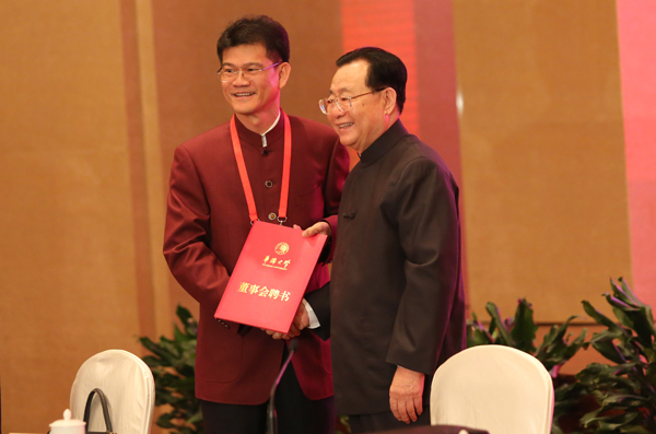 王刚董事长为施荣恒颁发华侨大学第七届董事会董事聘书(张林 摄)