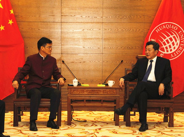 10月30日下午,国务院侨办副主任李刚在华侨大学厦门校区会见了华侨大学董事会董事、完美(中国)有限公司总裁胡瑞连。