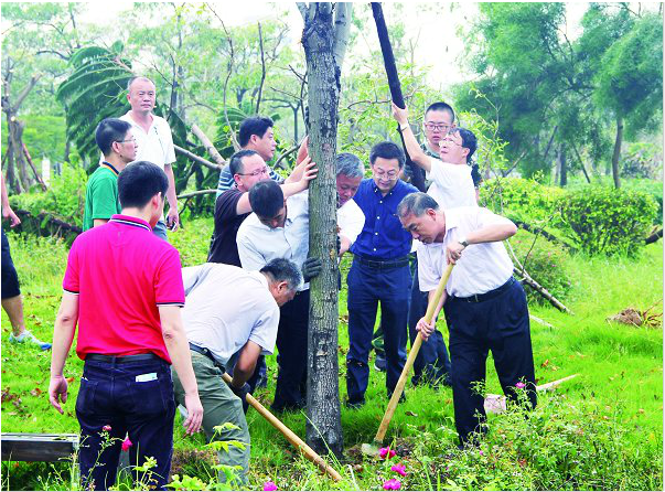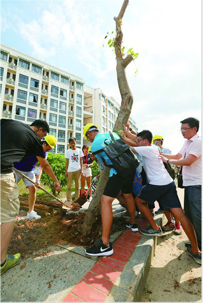 厦门校区各学院的新老生、党团员、学生干部陆续开展校园自救自助行动,各自划分片区,重点清理白色垃圾,协助扶起倒下的树木并浇水、加固。材料科学与工程学院两百余名学生以“从我做起,灾后重建”为口号,清理了所属宿舍楼栋区域和田径场周边的杂物;土木工程学院也组织爱心志愿服务队,打扫了实验室及办公区域;今年刚刚成立的新闻与传播学院尽管只有2016级的新同学在厦门校区,但他们对学校同样热情满满,主动帮忙搬运树枝、清扫落叶,疏通封堵道路;返校庆祝毕业10周年的建筑学院建筑学专业校友,也分别在泉州、厦门两校区协助重建……18日上午,来自厦航学院、信息学院、国际关系学院等没课的学生,来到受损严重的西飘逸园,和校领导贾益民、徐西鹏、刘塨、曾路及机关教工携手,齐心协力锯树枝、挖坑、扶树、架起三脚架、填埋好树根等,让一棵棵倒下的树木重新站起来。厦航学院大三学生黄梅和她的同学也在现场捡拾树枝,而这已经是她们台风后第三天参与劳动了。她说,以前上课经常从这里走过,看到那么多美丽的紫荆花,还有高高的大树,如今这番景象,“我们感到很惋惜、很心疼”。她说,明年就要毕业了,希望通过大家的努力,还能再看到美丽的紫荆花。