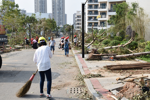 下车看到厦门校区满目疮痍的景象,同学们感慨万千,更坚定了他们用行动支援学校的决心。在后勤处老师的讲解和指导下,同学们按小组分工,开始紧张有序地进行灾后重建支援。带上安全帽,扛起铁锄头,他们挖坑、修枝、扶树、填土、压实、浇水,相互协助完成了一系列绿化植物的恢复保护措施。此外,同学们对道路两旁的落叶也进行了专门的清理,使周边道路整洁畅通,并将园区的垃圾进行分类装袋,运送到相应的垃圾处理点放置。“以扶树而谢师,以实际行动践行对恩师和母校的感念和回馈”,在这种信念的支持下,原本树木倾倒的谢师园也恢复了往日的郁郁葱葱。
