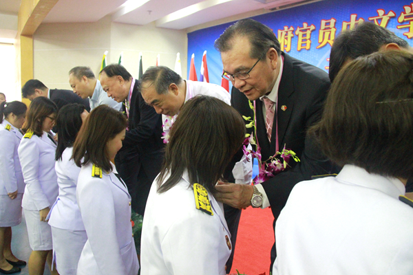 泰中文化经济协会副会长、教育委员会主席参猜,泰中文化经济协会副会长、教育委员会副主席颂喷,泰国国防部特别顾问比亚中将,泰国驻厦门总领馆领事谢婉玲,我校校长贾益民、副校长曾路等出席开学典礼并为学员佩戴华侨大学校徽。