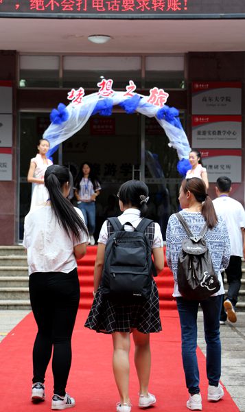 迎新现场,各学院迎新花样百出,使出了“洪荒之力”:化工学院以“化学工程师无所不能”为主题,把“实验室”搬到了迎新现场,用专业知识“变魔术”,他们将瓶瓶罐罐里的有色液体变出各种颜色,并营造出“烟雾缭绕”的意境,以此有趣的小实验,吸引新生,增强他们的专业认同感;外国语学院设置了涂鸦展板,邀请新生留下“青春印迹”,还展示了富有特色的太鼓舞表演;机电及自动化学院通过手机网络直播迎新现场,采访新生及家长,让迎新更加“时尚”“有趣”;信息科学与工程学院摆出了学生科创作品“四旋翼飞行器”“可移动智能机械臂”等,吸引眼球;经济与金融学院“快闪”热舞彰显青春活力;旅游学院红毯相迎、花门拱立……