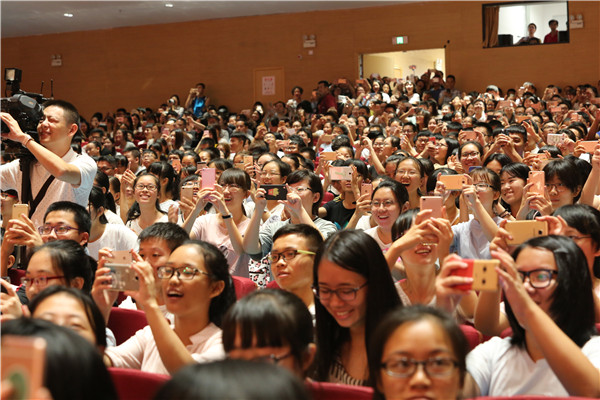 开学典礼结束后,谌龙、洪炜来到陈嘉庚纪念堂科学厅,与同学们近距离互动。而早早就在此等待的同学们已将科学厅的氛围燃到了极点。奥运健儿一出场,同学们就爆发出巨大的欢呼声和掌声。最幸运的莫过于在前排席地而坐的同学们,谌龙、洪炜热情地与他们一一握手。