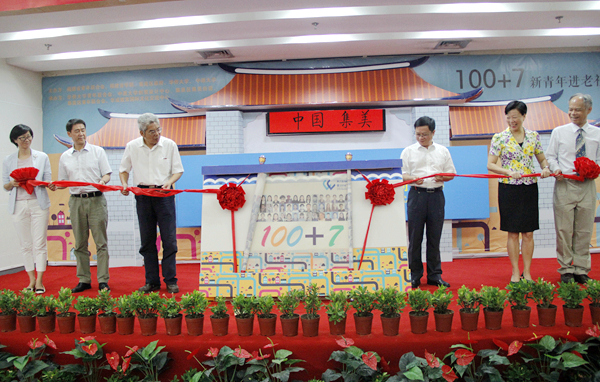 福建省青年联合会副主席兰明尚(右三)、华侨大学副校长刘斌(左三)、福建省侨办文宣处调研员秦大富(左二)、集美区委常委蔡冬梅(右二)、台湾中原大学设计学院黄庆辉(右一)、集美街道办事处主任郑小妍(左一)等共同拉开创意“卷轴”