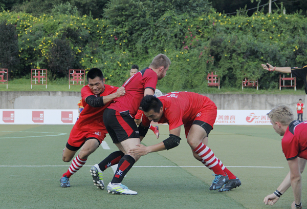 当日揭幕赛在斯塔福德郡大学和集美大学男子橄榄球队中展开,彭霈等观看比赛。