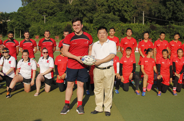 开幕式上,英国球员代表向彭霈赠送由中英双方球员签名的橄榄球