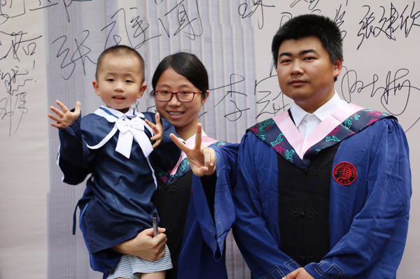 毕业生一家三口在签名墙前留影(龚雪熔 摄)