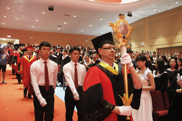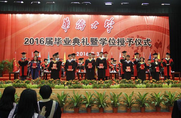 生物医学学院菲利普教授手持学术权杖入场。校领导贾益民、关一凡、朱琦环、吴季怀、徐西鹏、刘塨、刘斌、曾路、彭霈,校长助理张云波,学位委员、各学院院长及教务处、研究生院负责人就坐主席台。副校长吴季怀宣读华侨大学学位授予决定,对1062名研究生和4600名全日制本科毕业生分别授予博士、硕士、学士学位。副校长刘斌宣读对259名优秀毕业生、18名服务基层优秀学生和10名优秀青年志愿者的表彰决定。副校长徐西鹏主持典礼。