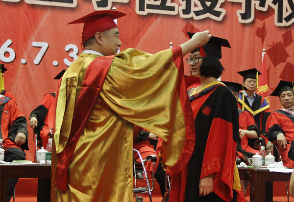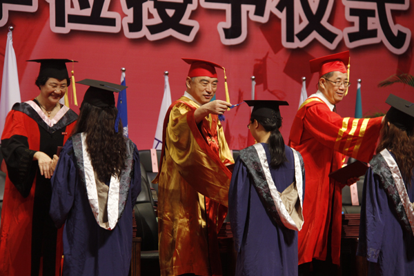 校长贾益民为博士毕业生拨穗并颁发学位证书