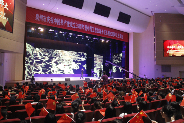 6月25日下午,陈嘉庚纪念堂观众厅成为了一片红旗的海洋。为庆祝中国共产党成立95周年暨中国工农红军长征胜利80周年,由中共泉州市委宣传部、市文明办、市文广新局、市文联、泉州晚报社、泉州广播电视台等主办,华侨大学党委宣传部、学工部、音乐舞蹈学院承办的“欢乐泉州•走进华大”文艺演出在我校上演。泉州市政协副主席李冀平,我校党委副书记朱琦环、副校长曾路,泉州各市直相关单位负责人,我校相关部门负责人等出席并观看了演出。