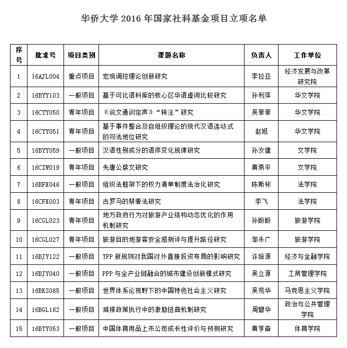 国家社科基金项目是我国现行哲学社会科学项目资助体系中级别最高、影响力最广、分量最重的科研项目,它具有引领科研发展、支撑学科建设、提升学校科研水平的强大牵引力。社科处表示,希望获得立项资助的学者认真研究,按计划高质量完成项目任务,推出精品,继续推进华侨大学哲学社会科学的繁荣与发展。