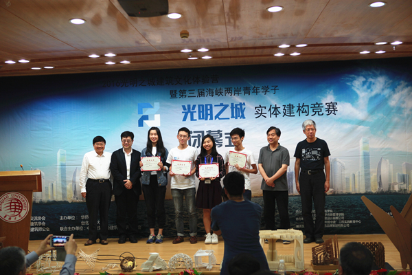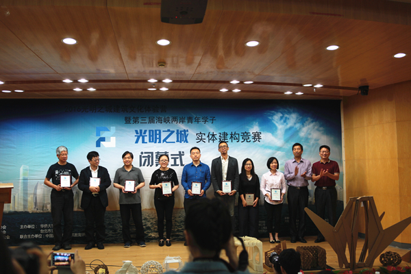 作为本次体验营的系列活动之一,第三届海峡两岸青年学子光明之城实体建构竞赛决赛也于当天结束。结合居住体验和专家评审意见,13组作品荣膺金、银、铜奖。其中,我校学生作品《月半藏圆》、中央美术学院学生作品《榕树下——与谁同坐》夺得金奖,逢甲大学《黄金比例》等4组学生作品获得银奖,台北科技大学《别有洞天》等7组学生作品获得铜奖。福建省台办副主任郑一贤,台湾建筑师公会理事、台湾建筑师公会学术委员会主任委员、台湾建筑师杂志社副社长张宏昌等为本届竞赛获奖者和优秀指导教师颁奖。