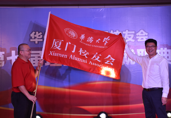 厦门校友会第六届会长周岁红与新当选会长刘宜量交接会旗