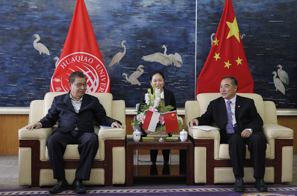 贾益民向Roesdiman Soegiarso介绍了我校与印尼相关教育机构以及华侨华人社会开展的合作情况。他表示,华侨大学愿意同塔鲁玛迦大学在华文教育等方面展开合作,并由此拓展至其他领域的教育合作。