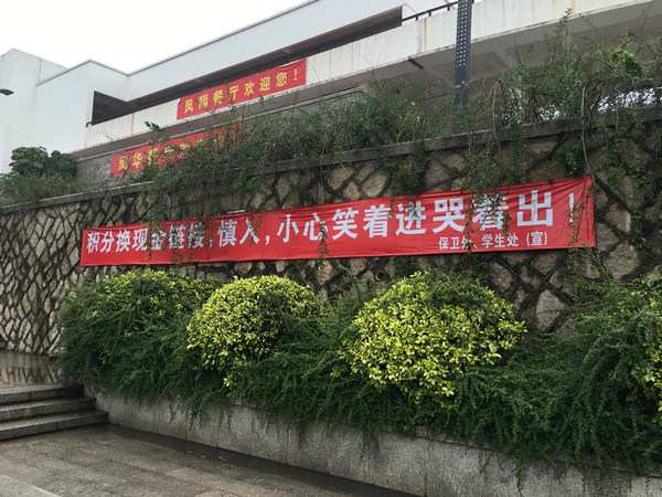法学院孙同学说,校区主干道LED电子大屏幕循环播放“反诈骗在行动”视频短片,学生宿舍区、图书馆、食堂、田径场、教学楼所到之处都是防诈骗横幅、海报及安全知识展板。“红色大条幅张贴的位置可谓一绝,教学楼及食堂正中央,这显然是想让同学们课前加餐、饭前加料呀!若是再有人因‘网上兼职刷信誉’‘不明网站购物’‘冒充领导老师借钱’而受骗,那真的是太任性了。”