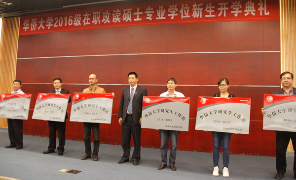 开学典礼上,吴季怀为陈金德等3名研究生实践导师代表颁发聘书,并向泉州农商银行等6家与我校联合建设研究生工作站的单位授牌。据介绍,此次联合建设华侨大学研究生工作站并聘任研究生实践导师是我校推进专业学位研究生培养模式改革、打造研究生产学研联合培养的关键环节,也是我校助力地方社会经济发展的重要举措之一。