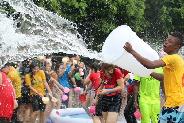 下午2点,东南亚国家泼水节活动率先拉开了文化节的序幕。来自泰国、马来西亚、印度尼西亚、菲律宾、老挝、缅甸等国家的学生身着节日的盛装,与来自其他国家及港澳台地区的学生相互泼水,庆祝东南亚佛历新年泼水节。