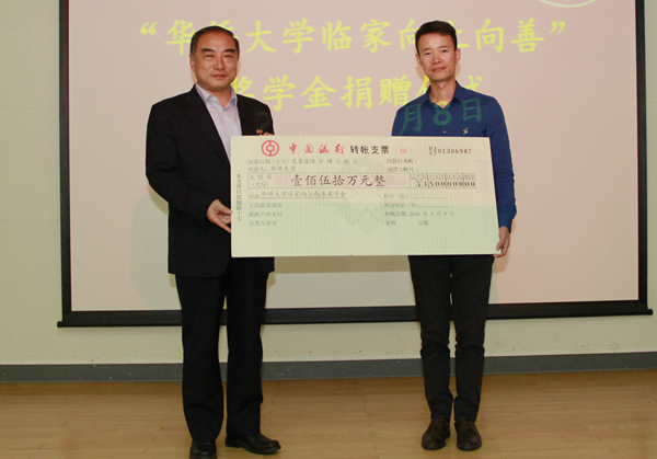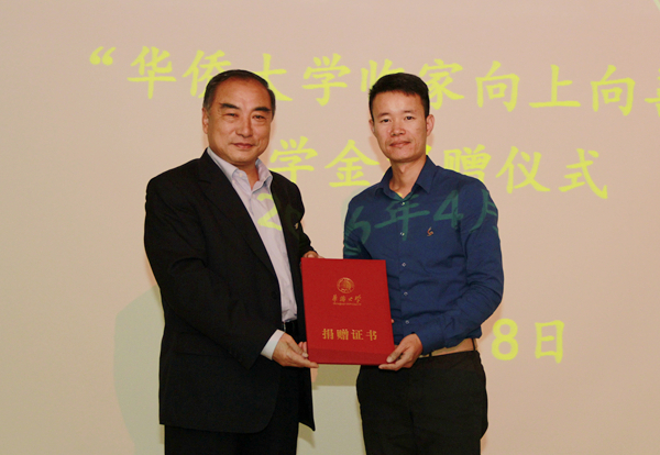 4月8日下午,我校工商管理学院2001届校友、厦门临家餐饮投资有限公司董事长邱尚振向母校捐赠150万设立“华侨大学临家向上向善奖学金”,用于表彰奖励积极向上,行善立德,热心公益,勇于担当的我校青年学生道德榜样。
