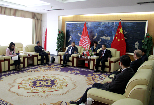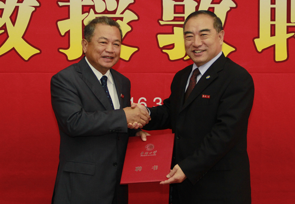 3月31日上午,泰国前驻华大使祝立鹏•暖西猜受聘我校名誉教授,校长贾益民为其颁发聘书并佩戴校徽。