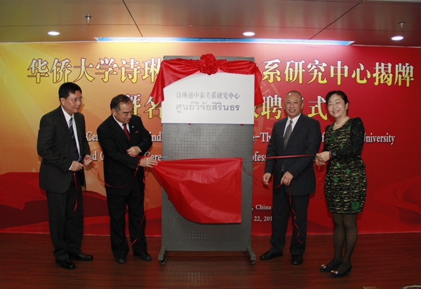 12月22日上午,华侨大学诗琳通中泰关系研究中心在华侨大学厦门校区揭牌,泰王国驻华大使醍乐堃、厦门市外事侨务办公室副主任黄新英、华侨大学校长贾益民、泰王国驻厦门总领馆总领事邱塔泰出席揭牌仪式并为研究中心揭牌。华侨大学副校长曾路主持揭牌仪式。
