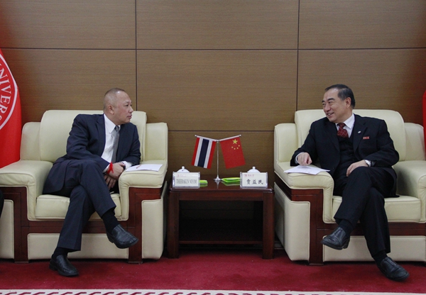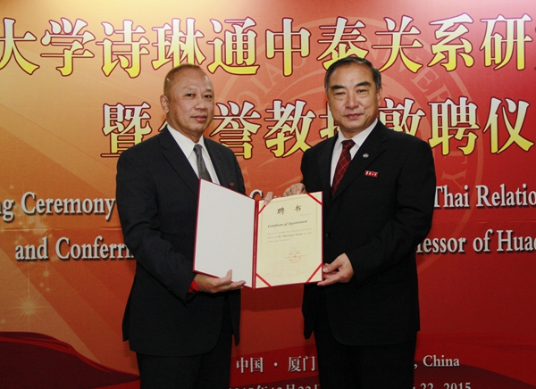 当天,泰王国驻华大使醍乐堃受聘华侨大学名誉教授,华侨大学校长贾益民为其颁发聘书。醍乐堃感谢华侨大学的信任与支持,表示将会尽自己最大的努力,促进华侨大学同泰国知名高校联系与合作。