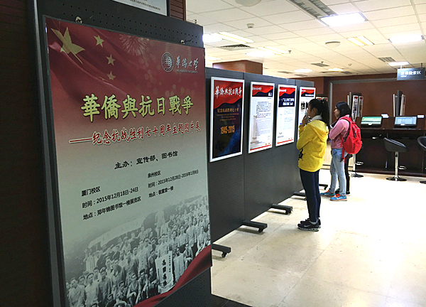 校党委宣传部、图书馆近日联合在厦门校区郑年锦图书馆一楼展厅举办“华侨与抗日战争——纪念抗战胜利七十年”主题图片展。展览12月18日开展,将持续至24日。