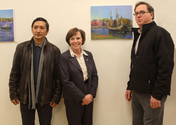 吴东弓副教授(左)、塞勒姆州立大学校长Patricia Maguire Meservey(中)、塞勒姆市议员Steve Dibble(右)在画展现场合影