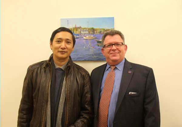 吴东弓副教授(左)和塞勒姆州立大学副校长Provost Silve(右)在画展现场合影