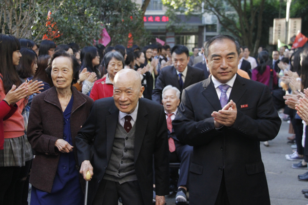 华大师生夹道欢迎庄善春伉俪及其亲属的到来