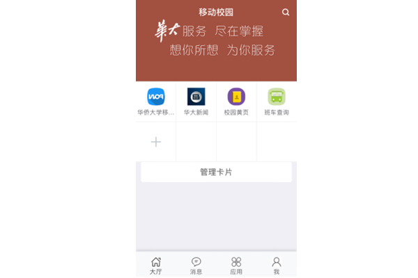 基于移动校园开放平台,第一期建设有“I华大”APP,同时支持IOS和Android,用户登录移动应用客户端后,首页的展示内容主要为个人在教学生活中所收藏的各种服务,并可以通过应用市场中下载权限范围内的应用。APP版整合了消息推送功能,可以根据应用类别集中展现和个人相关的消息内容,同时会根据消息推送策略进行相应的消息推送。