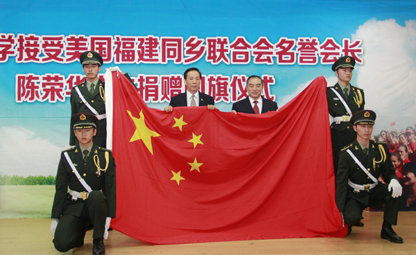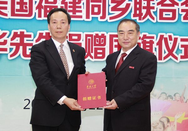 当天,当时升旗仪式的发起者、组织者、升旗手,现任美国福建同乡联合会名誉会长陈荣华及其夫人,将这面国旗捐赠给华侨大学。校长贾益民代表学校接受捐赠,并向陈荣华颁发捐赠证书。