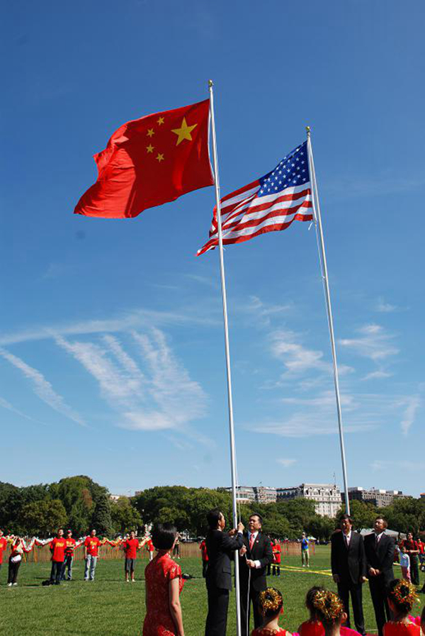 9月20日上午,万里晴空,前来参加活动的华侨华人身着红色T恤,挥舞着红色旗帜,使白宫前椭圆形大草坪变成一片红色海洋。约有2000人参加了当时的升国旗活动,中国驻美国特命全权大使周文重到场参加并致辞。