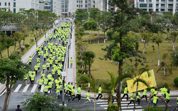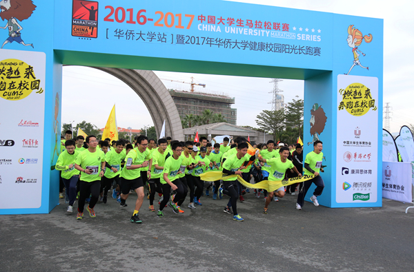 由中国大学生体育协会、华侨大学主办的中国大学生马拉松联赛(华侨大学站)暨2017年华侨大学健康校园阳光长跑赛,26日上午在厦门校区举行。近2600名华侨大学学生、教职工及校友自校正大门出发,途经音舞学院大楼、图书馆、机电大楼、综合教学楼群、主楼,最终回到正大门,绕两圈,共同完成了约4公里的迷你马拉松。