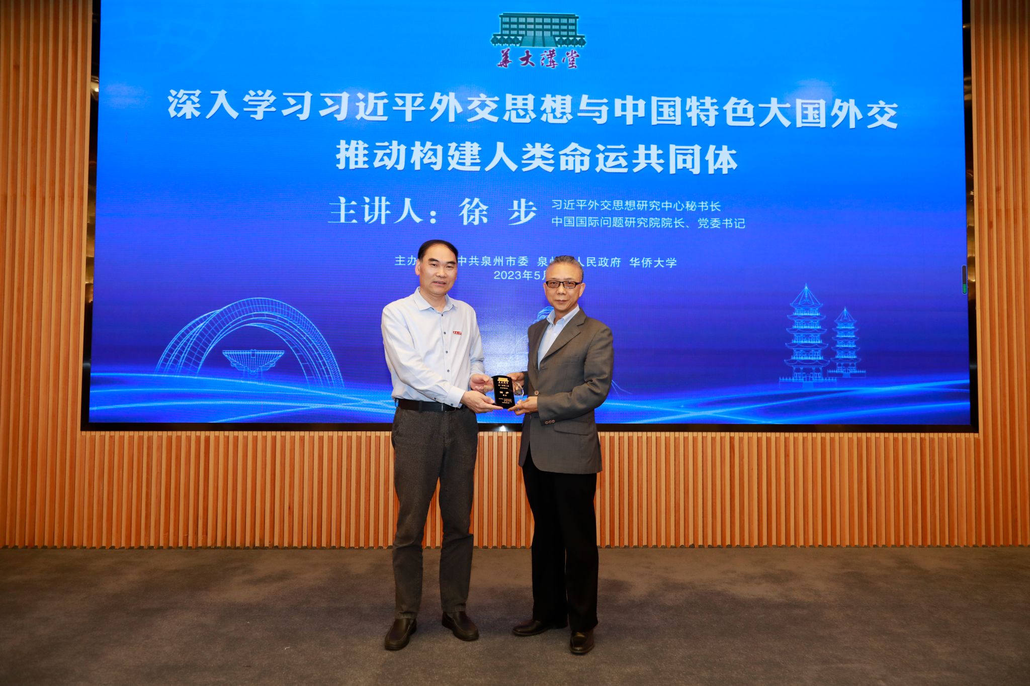 面对中华民族伟大复兴的战略全局与世界百年未有之大变局的交织激荡,如何深入学习习近平外交思想、如何理解认识中国特色大国外交、如何推动构建人类命运共同体?5月12日下午,习近平外交思想研究中心秘书长,中国国际问题研究院院长、党委书记徐步受邀做客“华大讲堂”第102讲暨教职工全员统战工作培训第九讲,就相关问题进行讲解。本场讲座也是华侨大学学习贯彻习近平新时代中国特色社会主义思想主题教育的专题辅导报告之一。