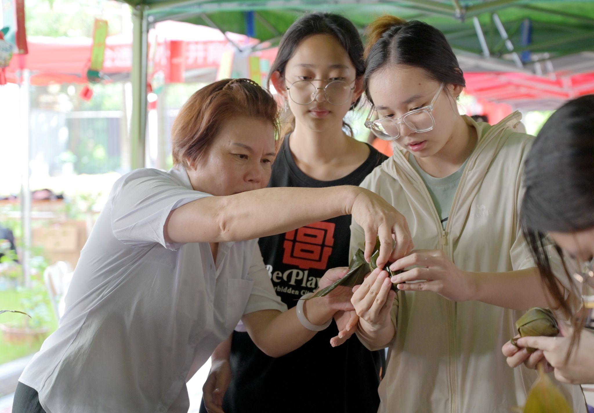除了亲手制作粽子,同画京剧脸谱、手作芬芳香囊、填色画涂折扇、手折涂色纸鸢……丰富多彩的民俗活动吸引了很多境内外同学,大家一同体验传统民俗,感受文化韵味。