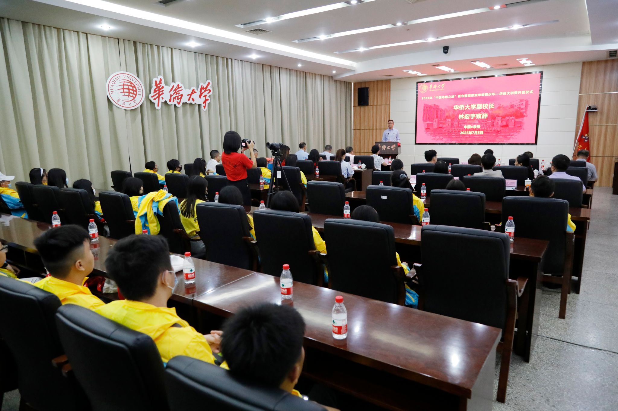林宏宇致欢迎词,他对一众嘉宾及营员表示欢迎,并介绍了华侨大学的“大华文”教育体系优势和国际化办学、海外交流成果。他希望学员们以此次活动为契机,多学、多看、多体验,深刻感受祖籍国日新月异的城乡发展变化,深入理解“一带一路”倡议,做中华文化的传播者和中外文化交流的友好使者。