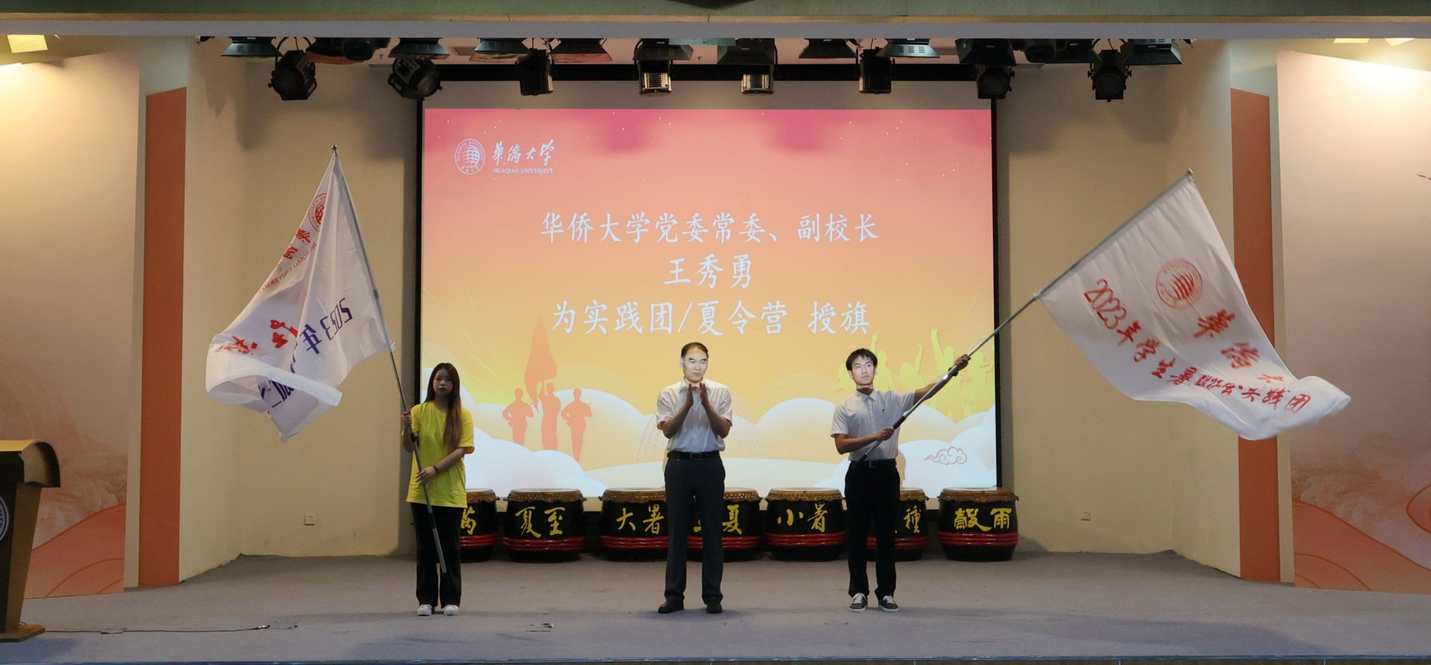 华侨大学副校长王秀勇出席出征仪式,并为社会实践团队、“中国文化之旅”夏令营团队授旗。学生处、教务处、校团委负责人,各团队实践导师及360余名学生参加出征仪式。