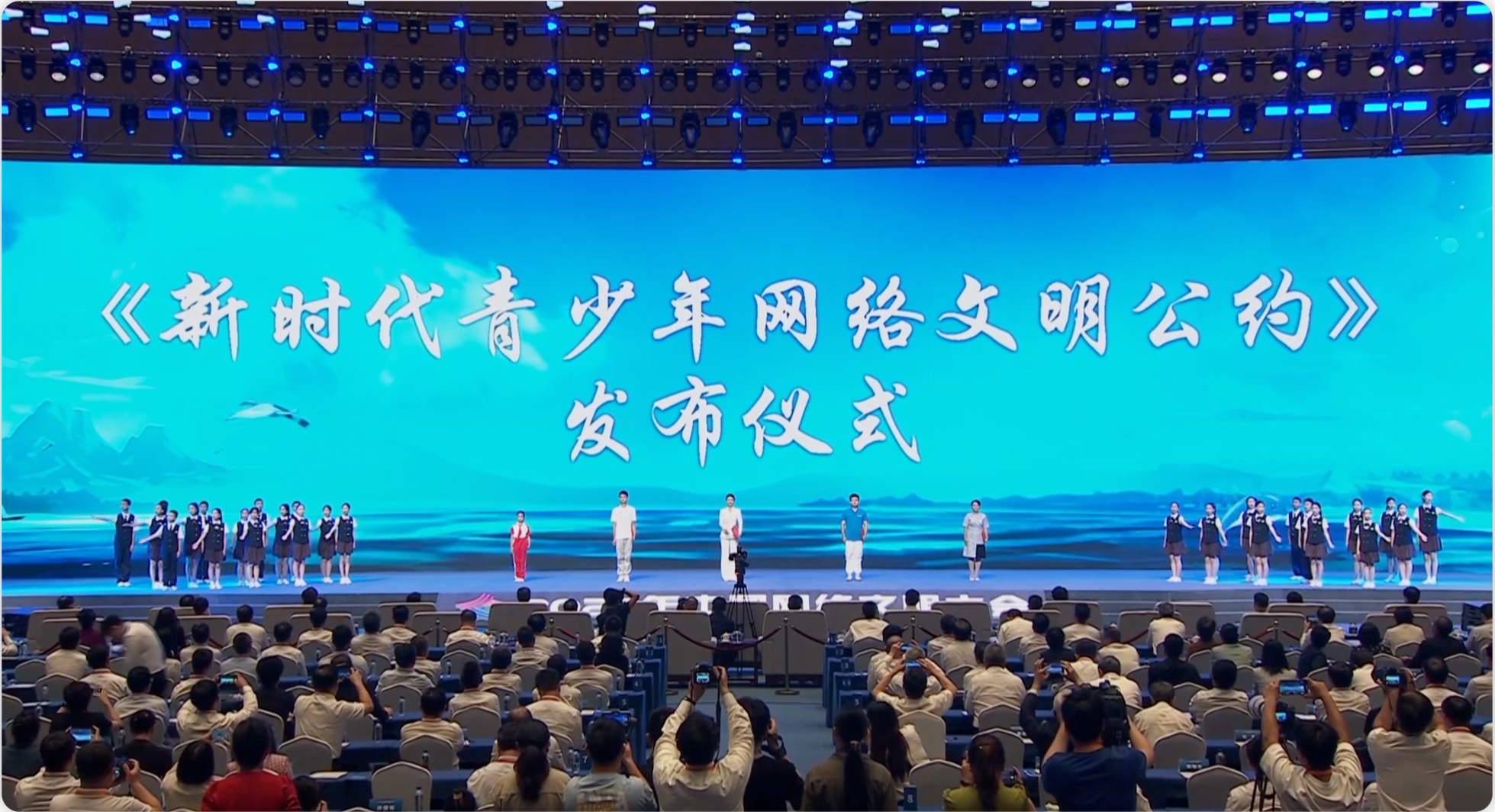 7月18日上午,在2023年中国网络文明大会上,北京育英学校学生赵梓伊、北京航空航天大学学生陈子龙、中央广播电视总台主持人龙洋、四川绵阳“敬礼娃娃”郎铮、华侨大学华文学院教师袁媛五位代表共同发布《新时代青少年网络文明公约》。