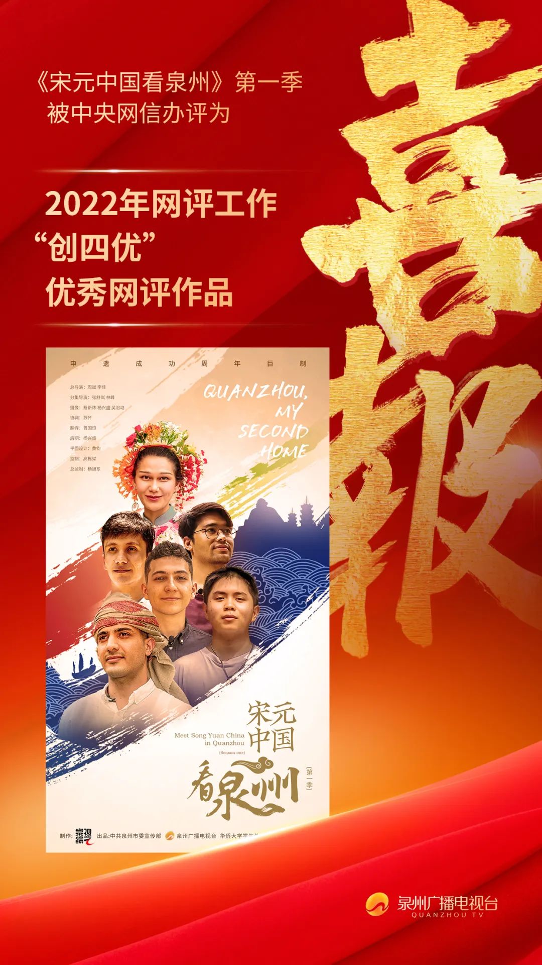 7月18日至19日,由中央网信办、中央文明办、中共福建省委和福建省人民政府共同主办的“2023年中国网络文明大会”在厦门举办。主论坛发布了2022年网评工作“创四优”竞赛活动成果,由中共泉州市委宣传部、泉州广播电视台、华侨大学学生处、华侨大学党委宣传部共同出品的《宋元中国看泉州》系列短视频(第一季)获评“优秀网评作品”。