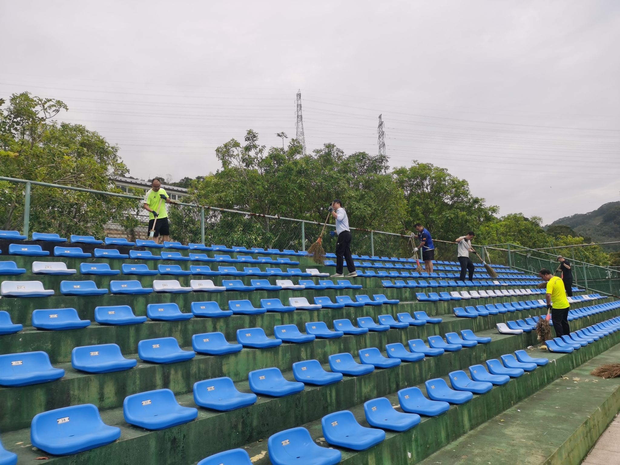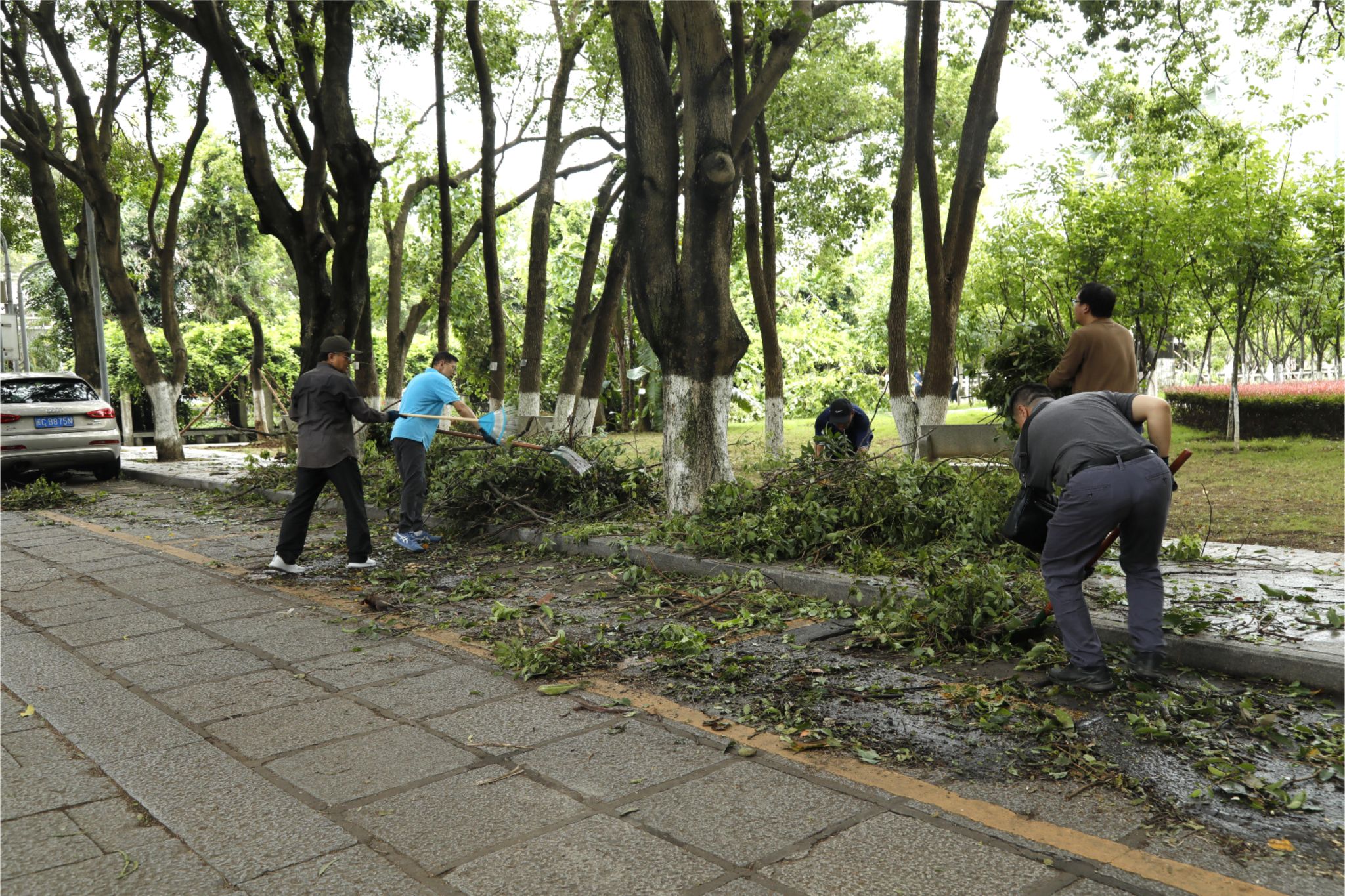 志愿者们在后勤工作人员的统一指挥安排下,手持扫把、铁耙、锄头、铁铲、畚斗等工具,兵分四路开展行动,有序前往主干道、教学楼、住宿区、运动场等区域,清理道路、水沟及绿化带上的断枝、枯叶;扶正花盆、垃圾桶、自行车、电动车及运动场地内座椅等倒伏物品;挪开阻碍交通的断木……