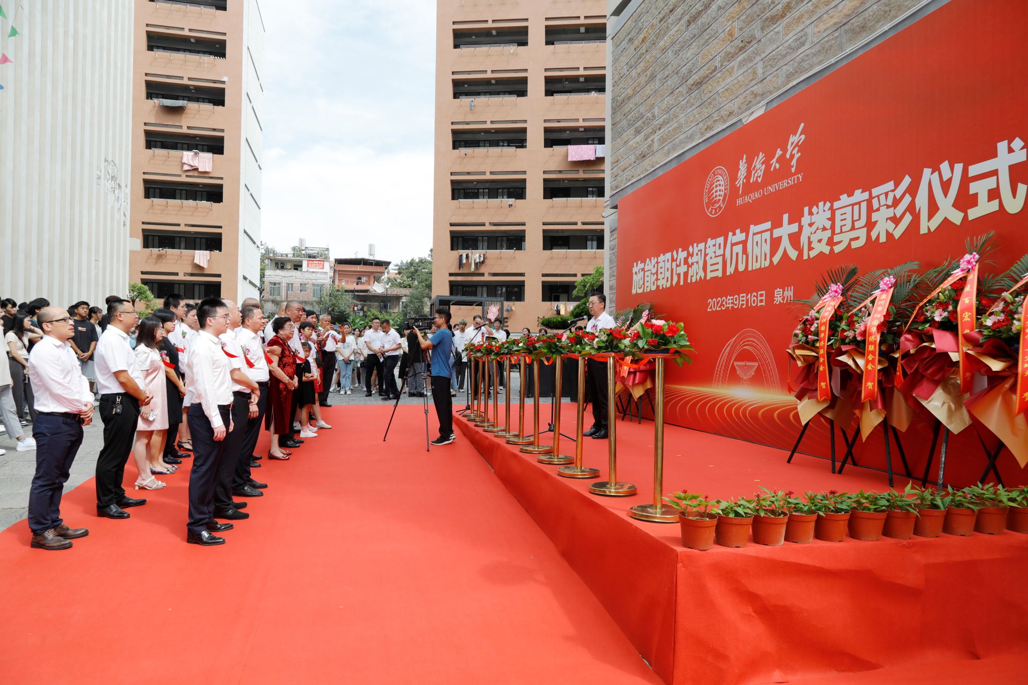 9月16日上午,华侨大学举行施能朝许淑智伉俪大楼剪彩仪式。华侨大学董事会董事、福建百宏集团董事局主席施天佑及母亲许淑智,华侨大学党委书记徐西鹏,泉州市侨联党组书记、主席温锦辉,福建百宏集团总裁吴金表,福建百凯集团总裁林金井等出席。华侨大学副校长王秀勇主持剪彩仪式。