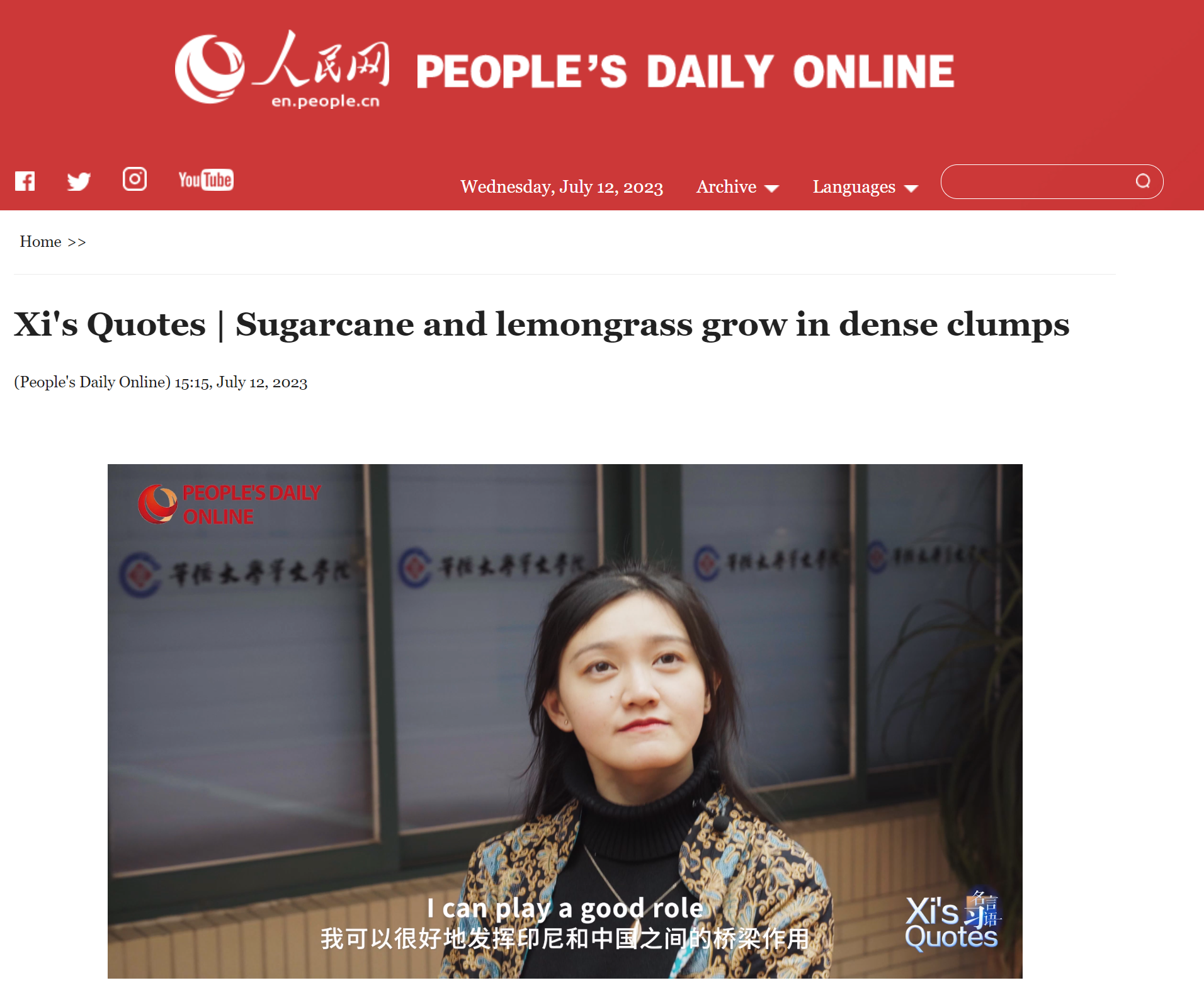《Xi's Quotes | Sugarcane and lemongrass grow in dense clumps》(指导老师:王祎)以习近平主席在二十国集团领导人第十七次峰会讲话中引用的印尼谚语“甘蔗同穴生,香茅成丛长”为题,介绍了白家嘉对于这句“名言习语”的理解:“‘一带一路’倡议给印尼带来了很多发展机遇,这让我更加认识到只有团结共生,才能合作共赢。”在华侨大学留学五年的她,也不断发挥着在中印尼两国间的桥梁作用,为推动两国文化交流贡献力量。